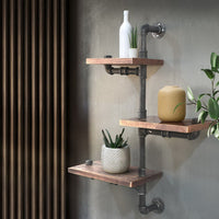 Featuring a set of urban rustic floating pipe shelf that is perfect for homes, offices and cafe interiors. Made from quality metal pipe and solid timber, this unique pipe shelf is designed to fit any space including wall corners. Direction of each shelf can be adjusted before or after being hung.